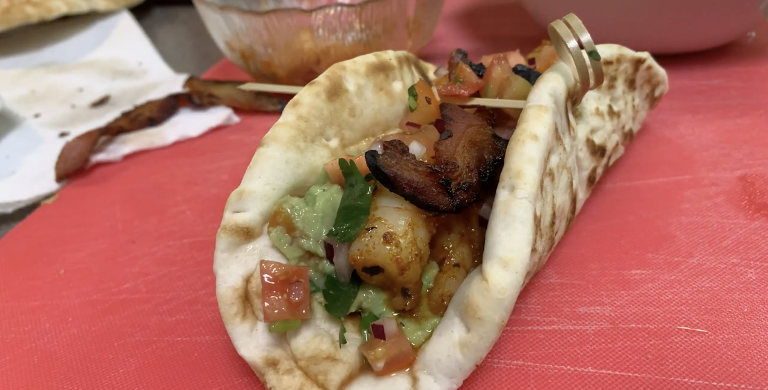 - To assemble the wrap, spread the guacamole onto the pita. Follow with the shrimp, bacon and the shrimp. Finish with pico de gallo, and wrap the tortilla. Use a skewer to secure the wrap and serve warm.