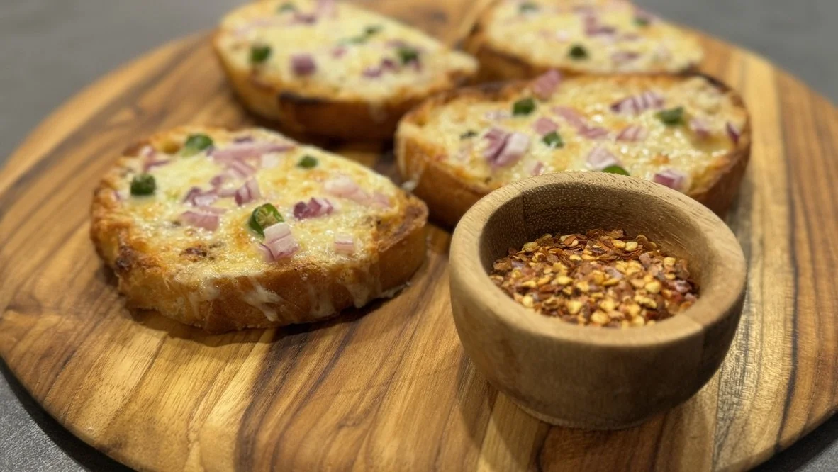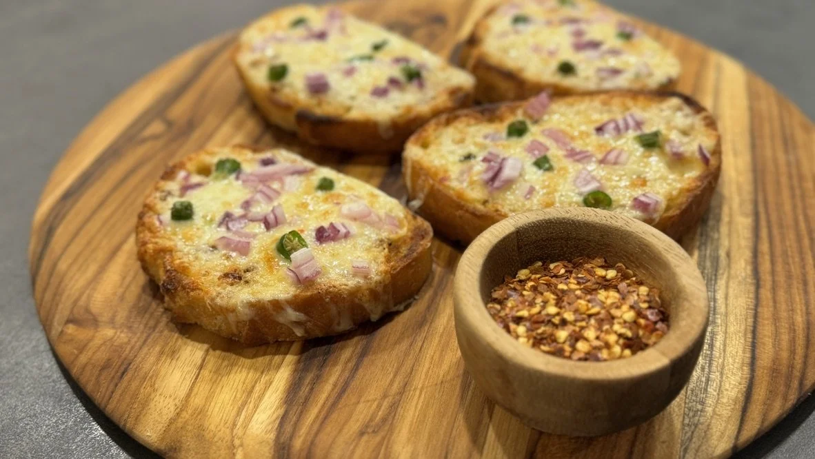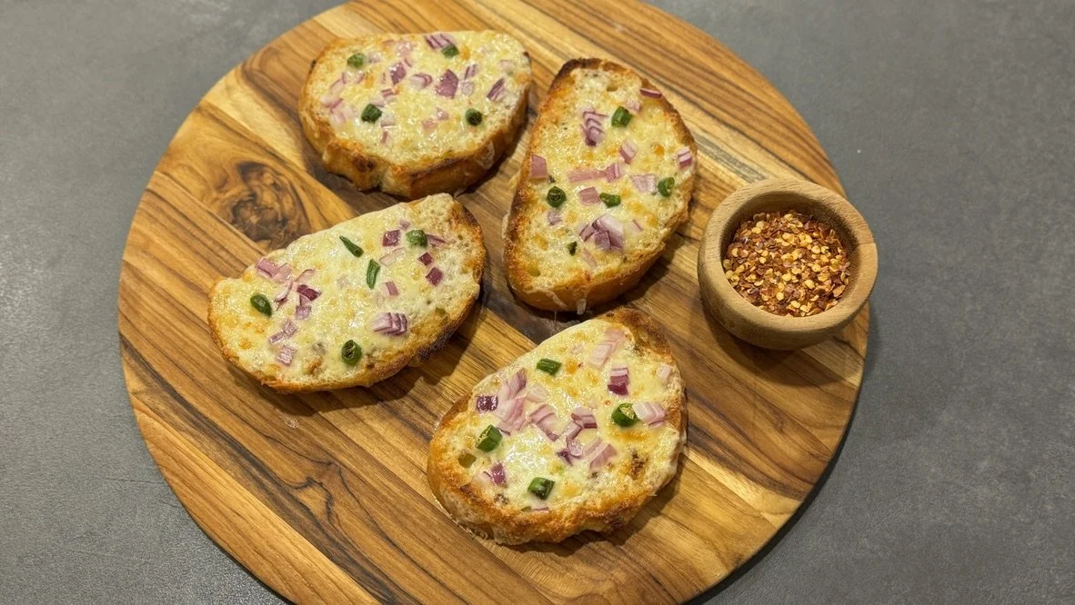 If you’re in North America, you’re probably familiar with the Cheesy Garlic Bread from Pizza Hut. For this recipe, we’ll basically be replicating that, but with an Indian touch - the heat of course! Don’t worry, these won’t be too spicy for you, and you can always adjust the amount of toppings to your preference!