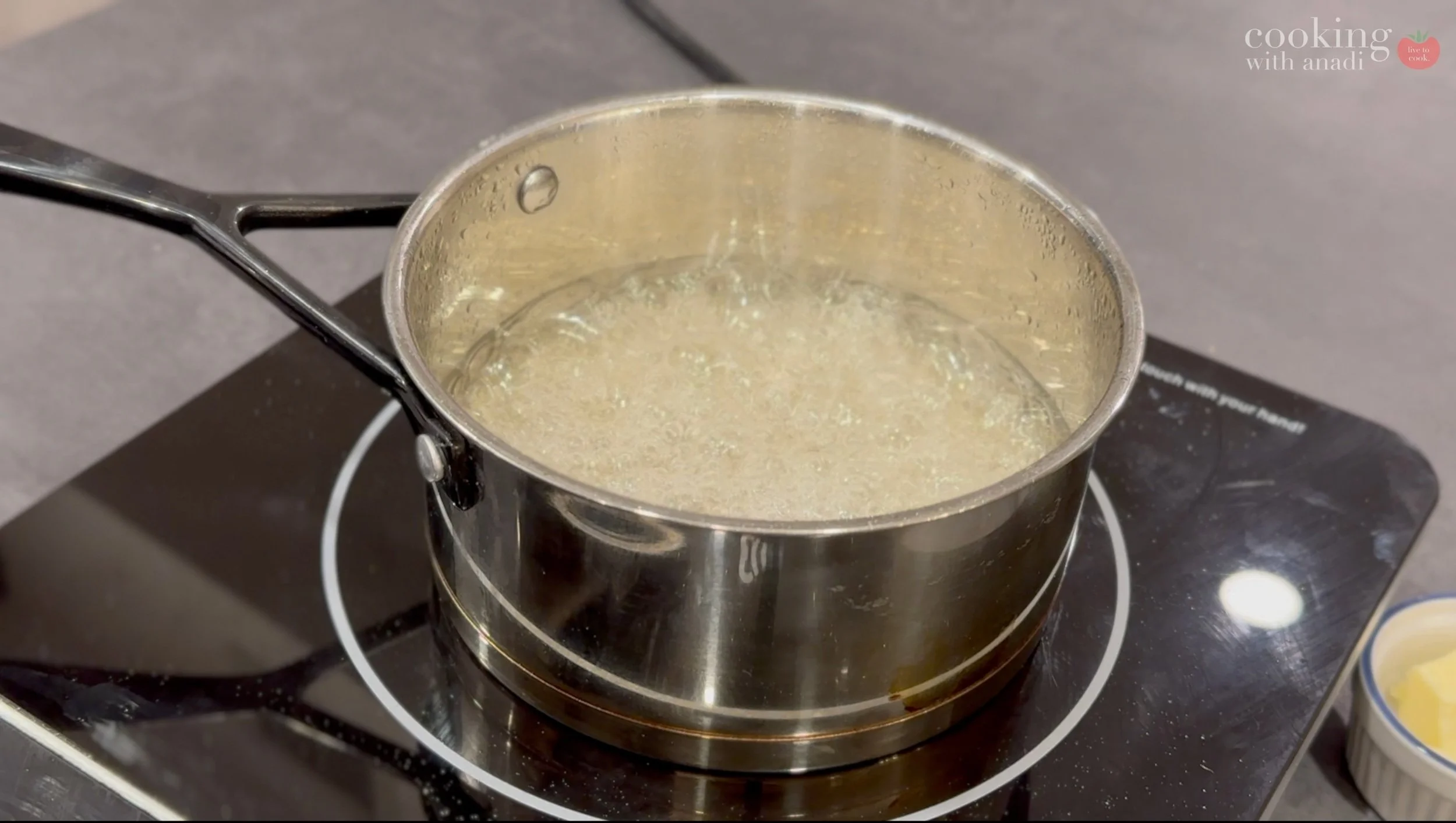 - In a saucepan, add the water and sugar and turn on the heat. Whisk well and warm the mixture until the sugar has completely dissolved.