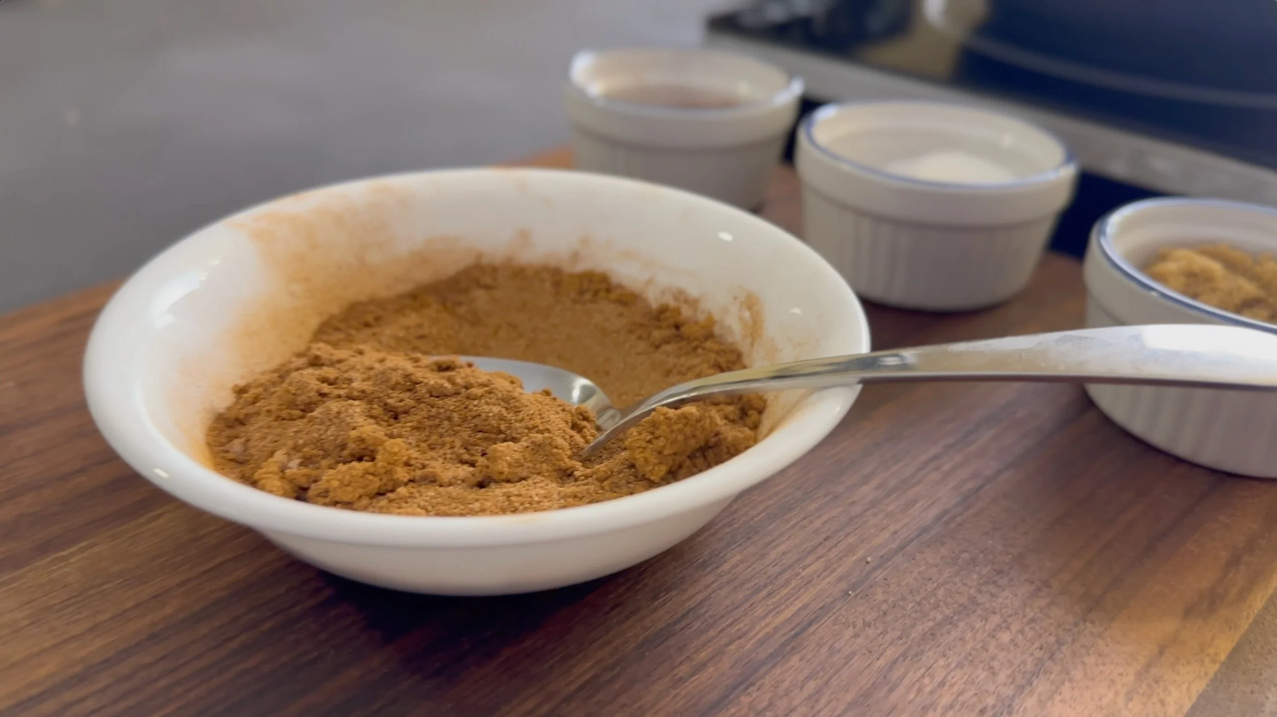 - Prepare the cinnamon sugar by mixing all of the ingredients together. The ratio of cinnamon to white sugar to brown sugar is 1 : 2 : 1.