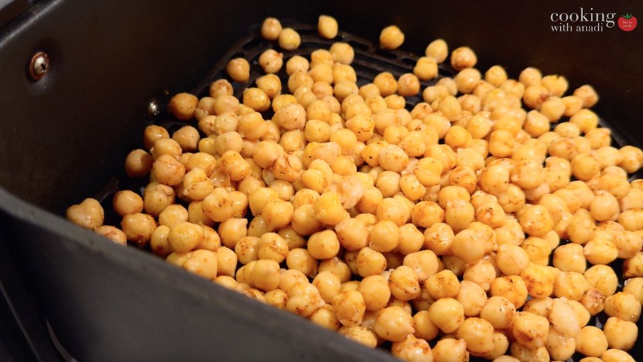 - Cook for 15 minutes, shaking the basket halfway through. Chickpeas should feel firm and sound hollow when tapped. If needed, cook for an additional 3–5 minutes.