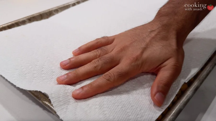 - Drain and rinse chickpeas if using canned. Pat completely dry with paper towels, then let sit for 5 minutes to remove excess moisture.