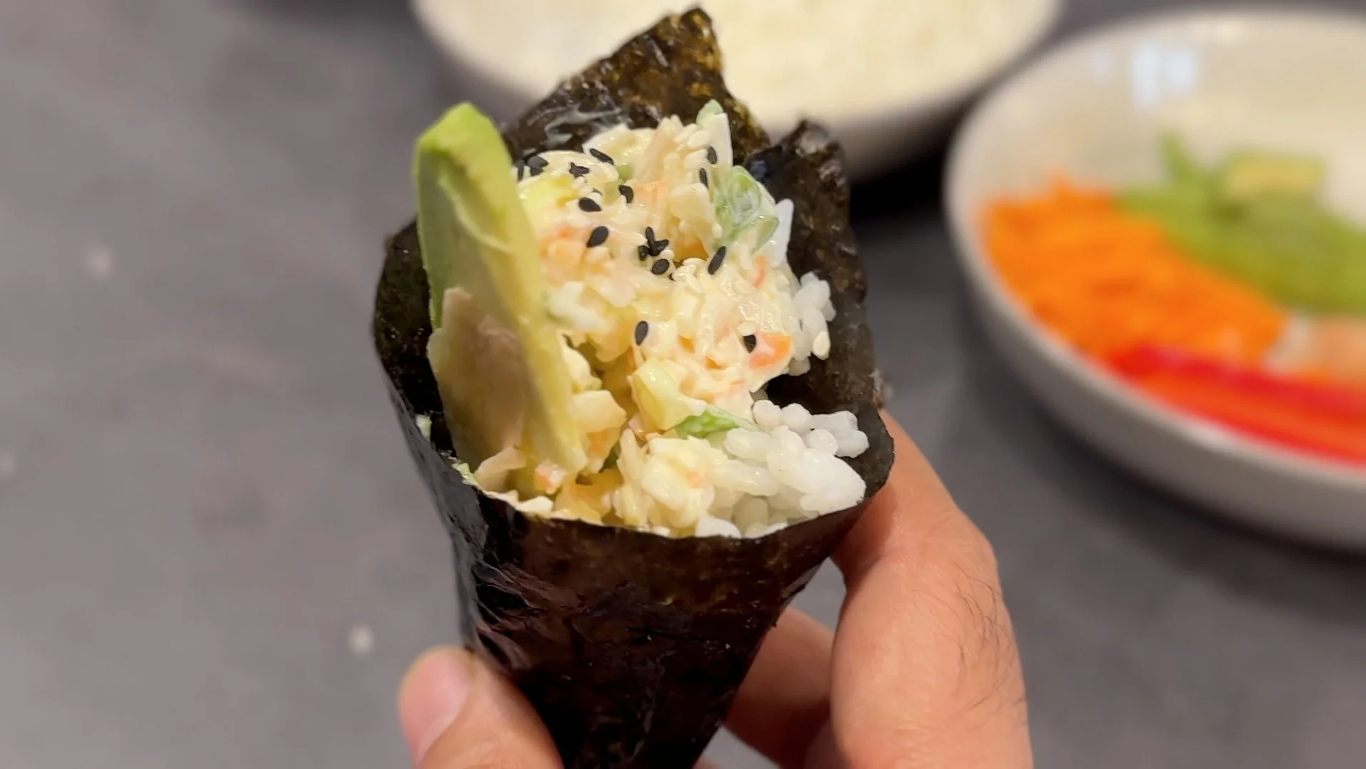 - For the California Temaki: Add 1-2 Tbsp of the crab mix over the rice, top with pickled ginger, cucumber and avocado.