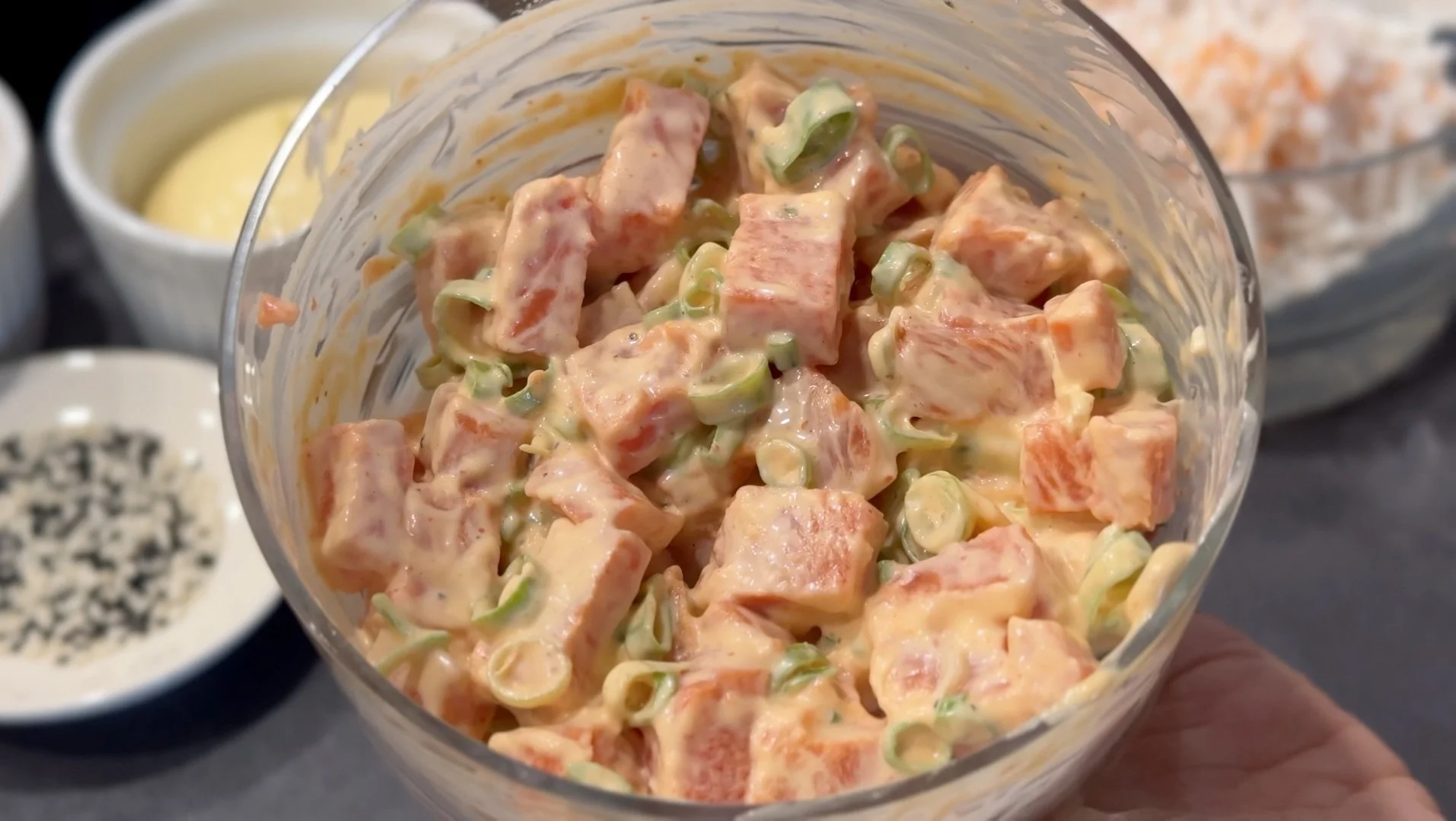 - Prepare the Spicy Salmon mix, cube the salmon into 1/2 inch cubes and place in a bowl. Add the spicy aioli, green onions and mix well. Refrigerate until ready to use.
