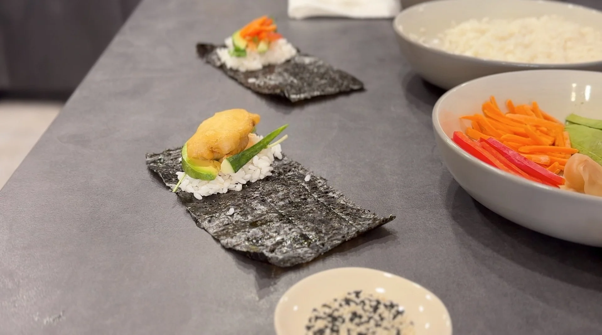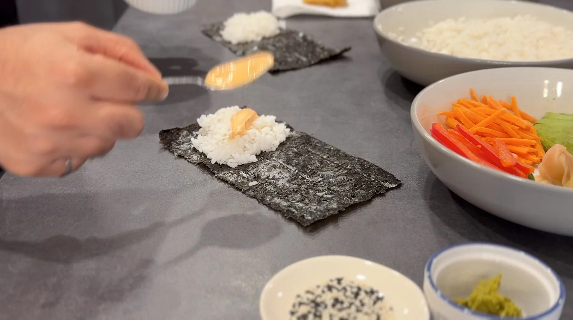 Getting the right amount of sushi rice on the nori sheet is key to ensure the ingredients all compliment each other. Make sure to not use too much or too little rice.