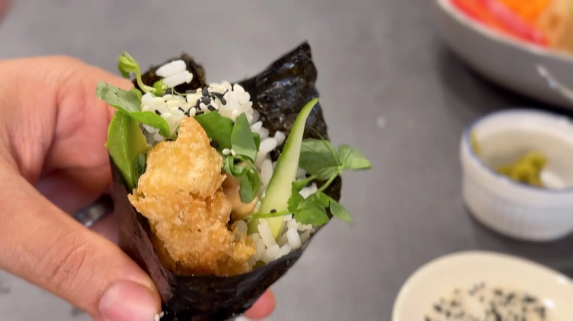 - Shrimp Tempura Temaki: Fry the shrimp tempura in the deep fryer for 1 minute. Spread the spicy aioli on the rice diagonally from the top left corner to 3⁄4 of the way to the bottom. Place the pickled ginger over the spicy aioli, add micro greens on top, followed by the cucumber and avocado on either side. Place the tempura shrimp over the micro greens.