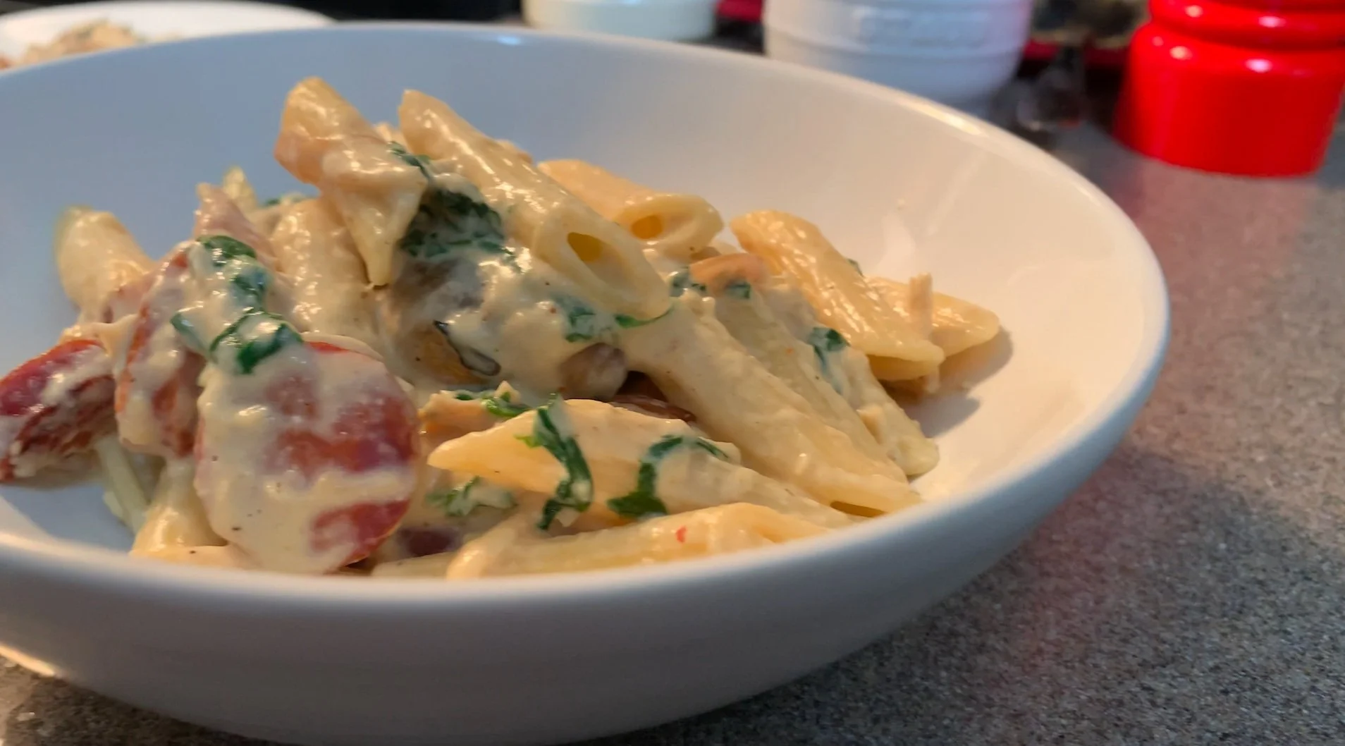 I quite literally just used what I had in my fridge to make this the first time. I had some cooked chicken breast from the previous night’s dinner, so that saved some time to get this pasta ready! I was craving a creamy white sauce, so I prepared my classic Béchamel Sauce. I needed to finish some cream cheese, so I elevated that white sauce by adding in some mozzarella cheese and cream cheese! I sautéed some chorizo with onions and whipped up some garlicky spinach. I tossed in some penne pasta and added all these components in and there we go! An incredible lunch!